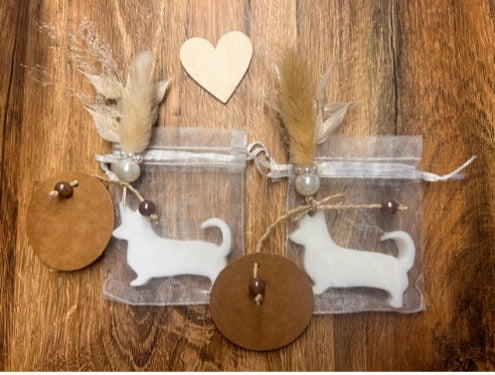 Klein, individuell, herzberührend – das Gastgeschenk „Seifenglück“ ist eine liebevolle Geste, die bleibt. Die handgemachte Seife in deiner Wunschform (hier gezeigt: Corgi mit und ohne Schwänzchen 🐶 und Herzchen) liegt gebettet in einem zarten Organza-Säckchen und wird veredelt mit Trockenblumen, Perlendetail und Juteband, eine perfekte Kombination aus Natürlichkeit und Eleganz.