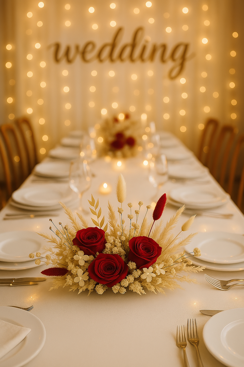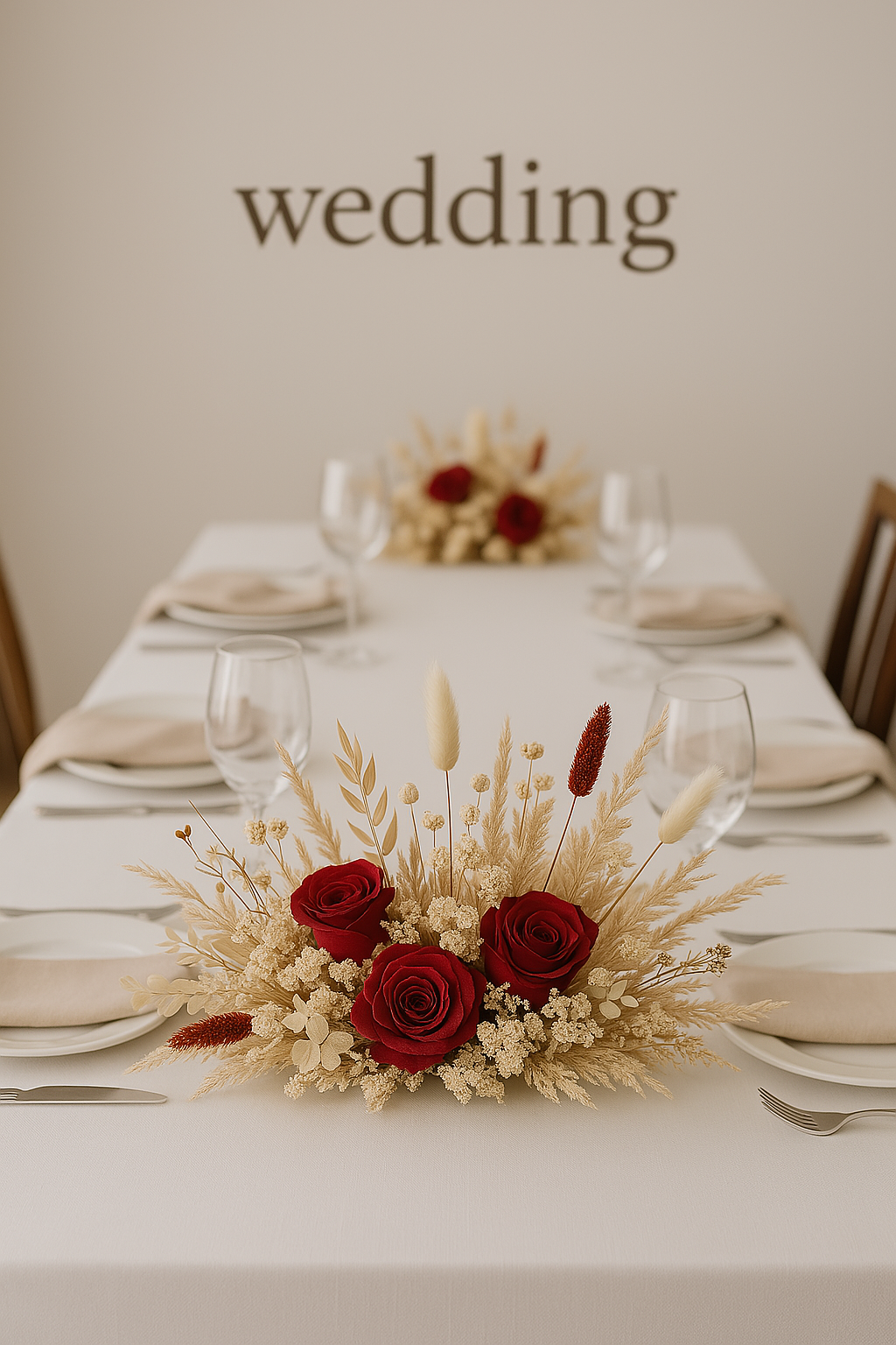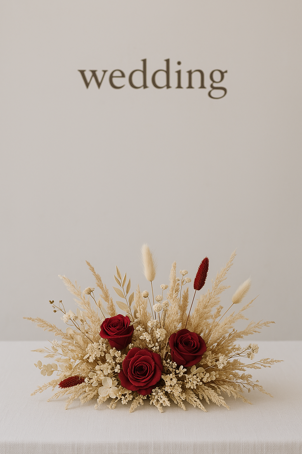 Ein echter Blickfang mit Tiefe und Charakter: Das Trockenblumen-Tischgesteck „Crimson Elegance“ vereint die natürliche Leichtigkeit von Pampasgras und Schleierkraut mit der leidenschaftlichen Ausstrahlung tiefroter Rosen. Das Arrangement in Beige-, Creme- und Bordeauxtönen bringt eine stilvolle Wärme auf jeden Tisch, ob zur Hochzeit, Verlobung oder als Dekoration für besondere Anlässe.