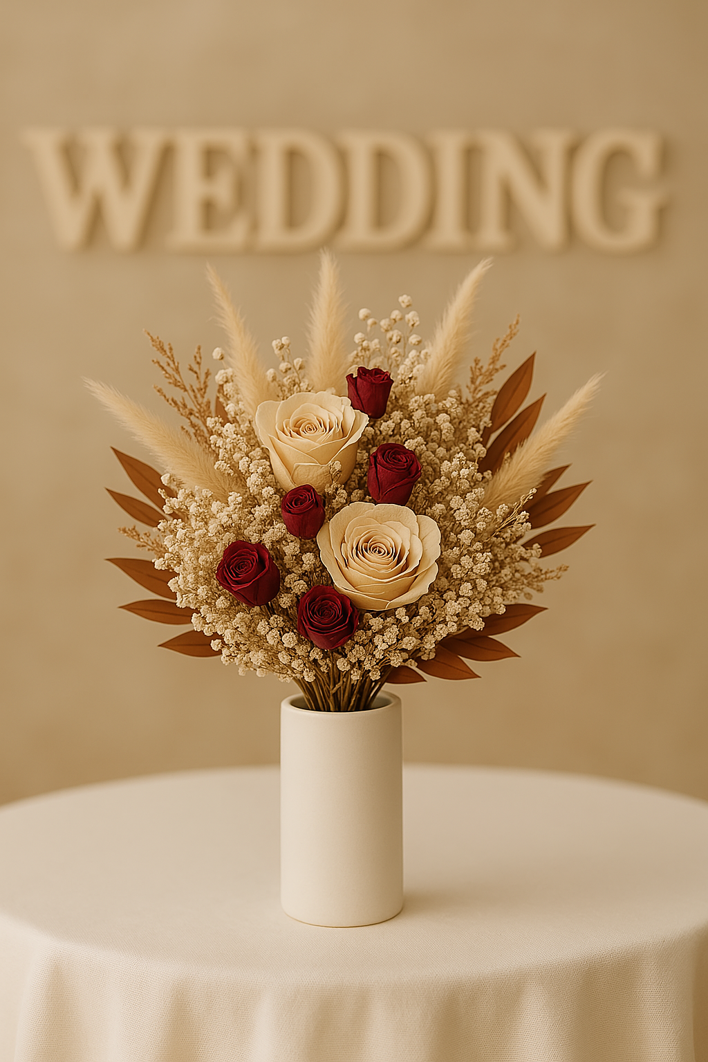 Ein Strauß voller Gefühl - „Autumn Romance“ vereint die sanfte Wärme natürlicher Töne mit der tiefen Symbolkraft von sattem Bordeaux. Die Kombination aus zartem Schleierkraut, naturfarbenem Pampasgras, konservierten Rosen in Creme und intensivem Rot sowie braunem Ruskus ergibt ein harmonisches und zugleich ausdrucksstarkes Arrangement. Perfekt für Herbsthochzeiten, emotionale Augenblicke oder als stilvolles Geschenk mit Charakter.